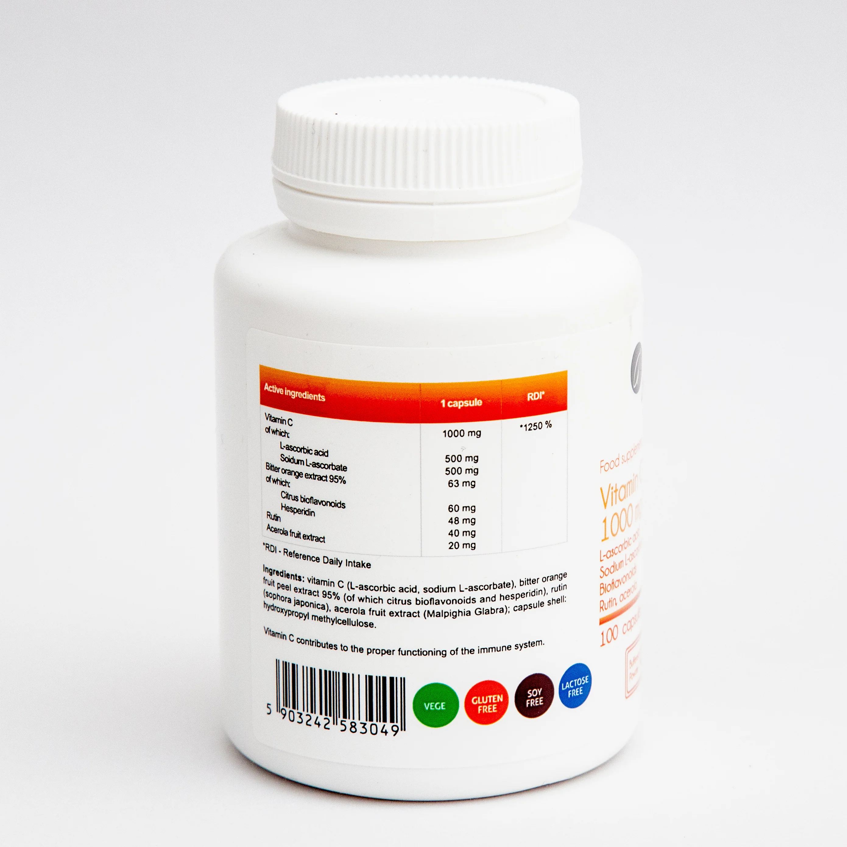Ingredients: Vitamin C: L ascorbic acid and sodium ascorbate, bitter orange fruit peel 95%, 25: 1 including citrus bioflavonoids and hesperidin, rutin (sophora japonica), acerola fruit extract (Malpighia Glabra), glazing agent (coating capsules): Hydroxypropyl methylcellulose (HPMC).